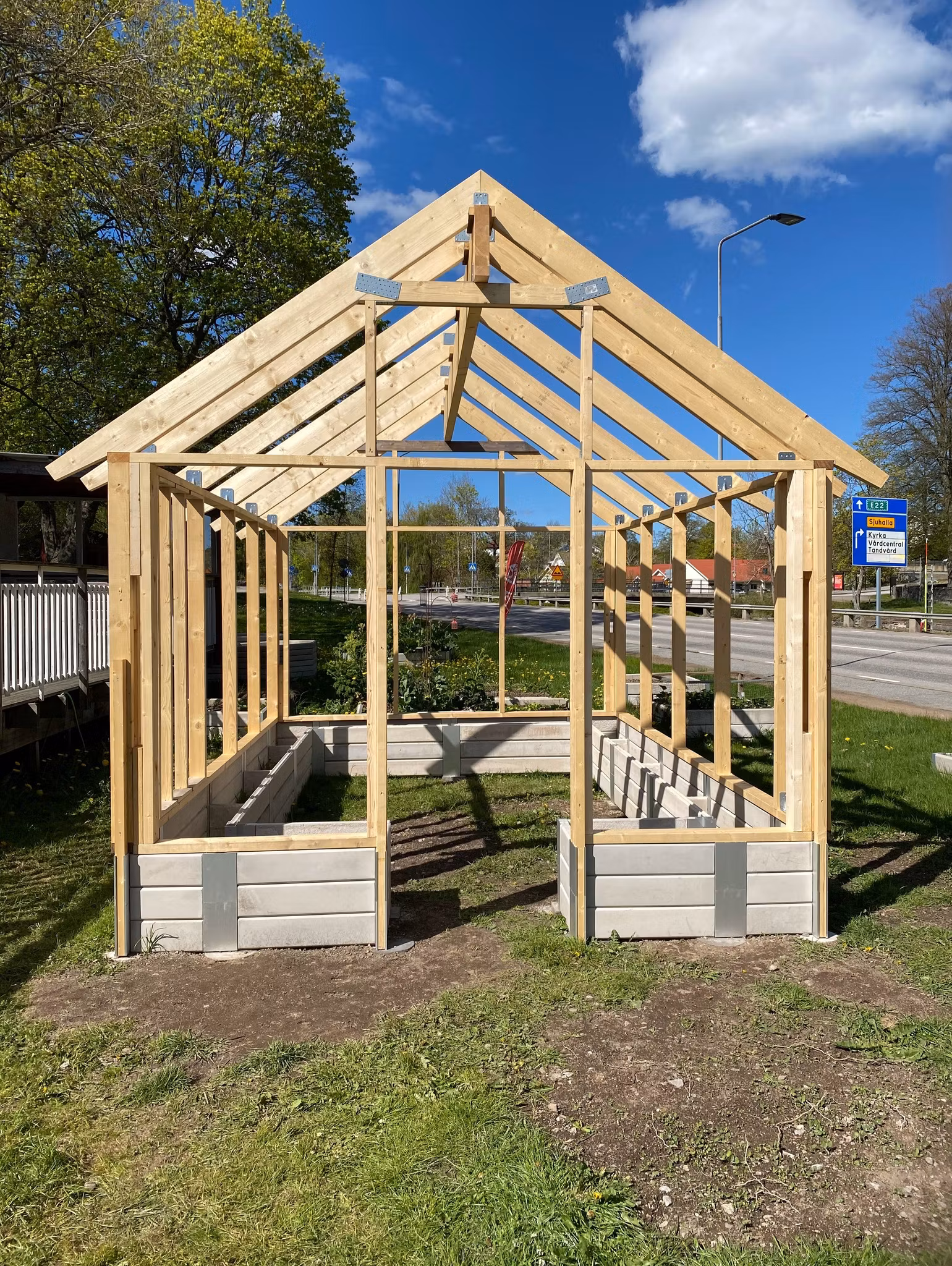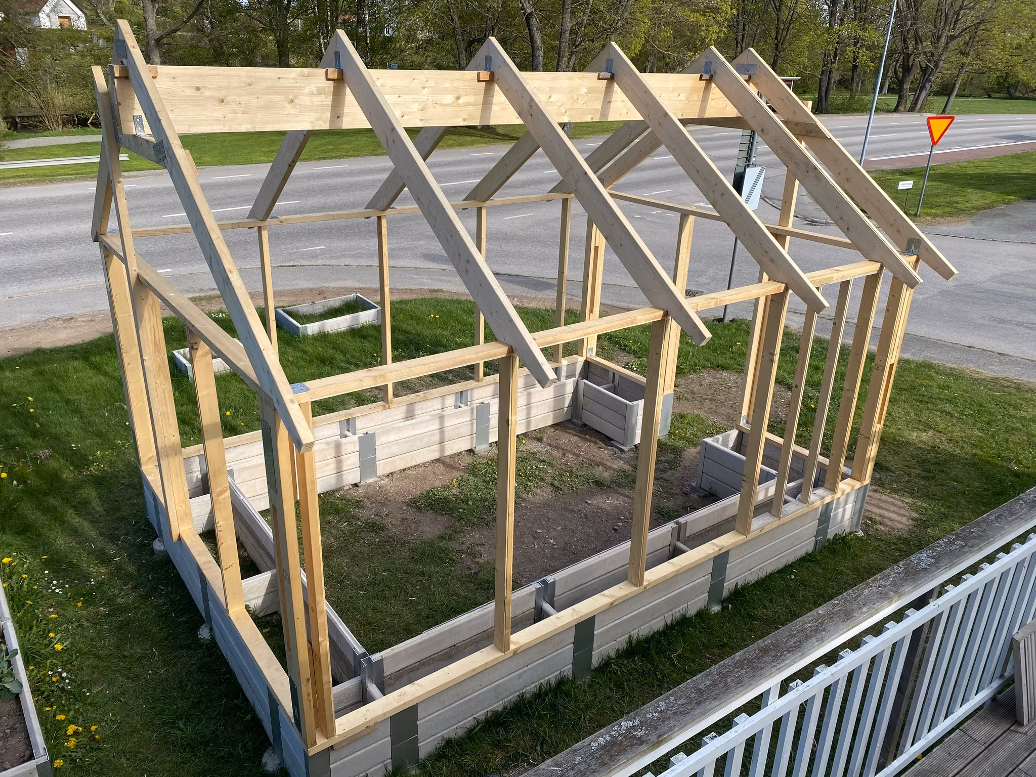 Man kan också köpa en byggsats där grunden(odlingslådorna), väggreglar och takstolar ingår. Vi behöver veta måtten på växthuset, samt måtten på de fönster som ska användas. Takstolar och reglar levereras färdigkapade med beslag. Monteringen gör beställaren själv.